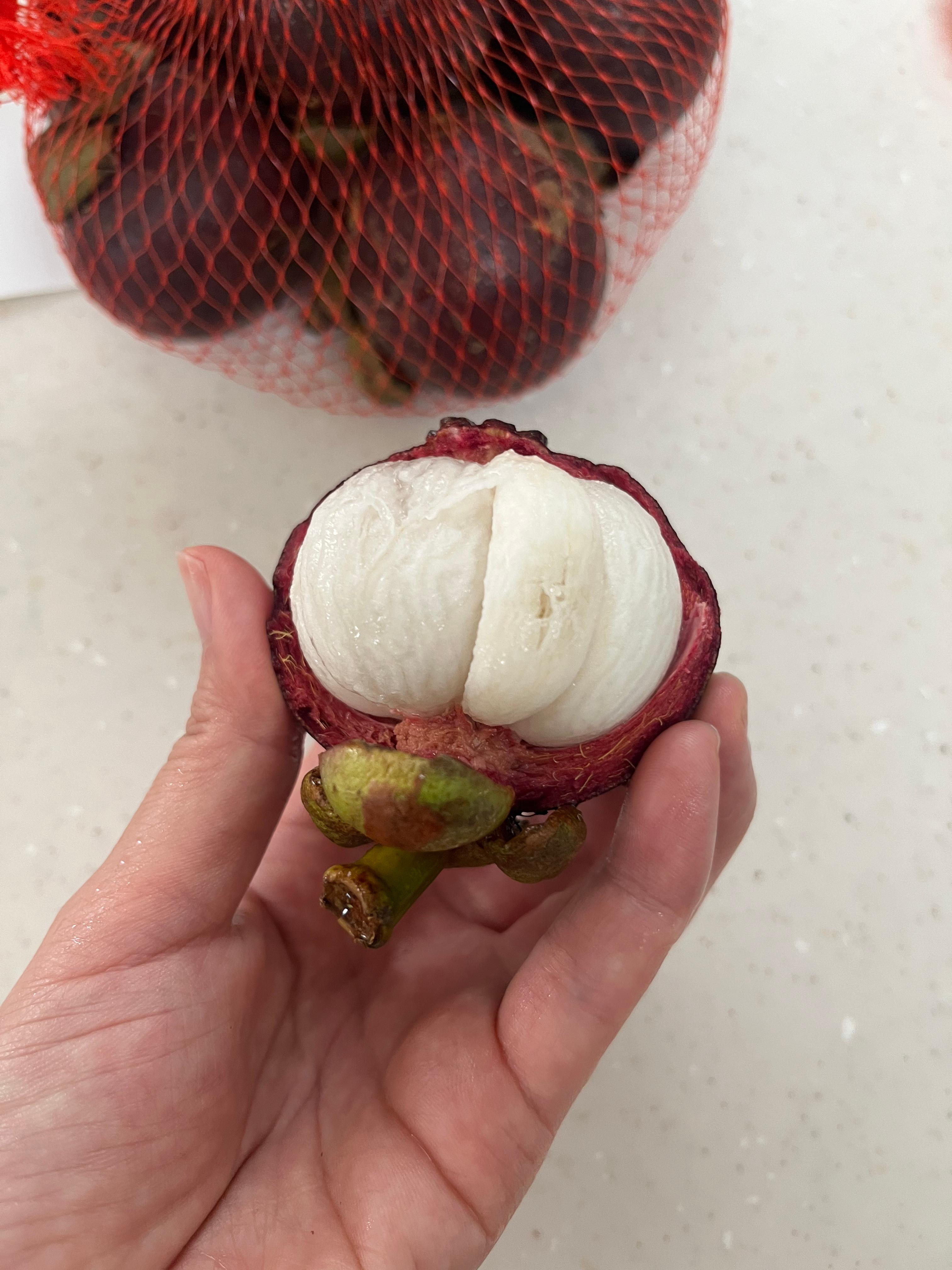 - 망고스틴의 과육은 탱글한 흰색이며, 달콤하고 부드러운 식감을 지닌다.