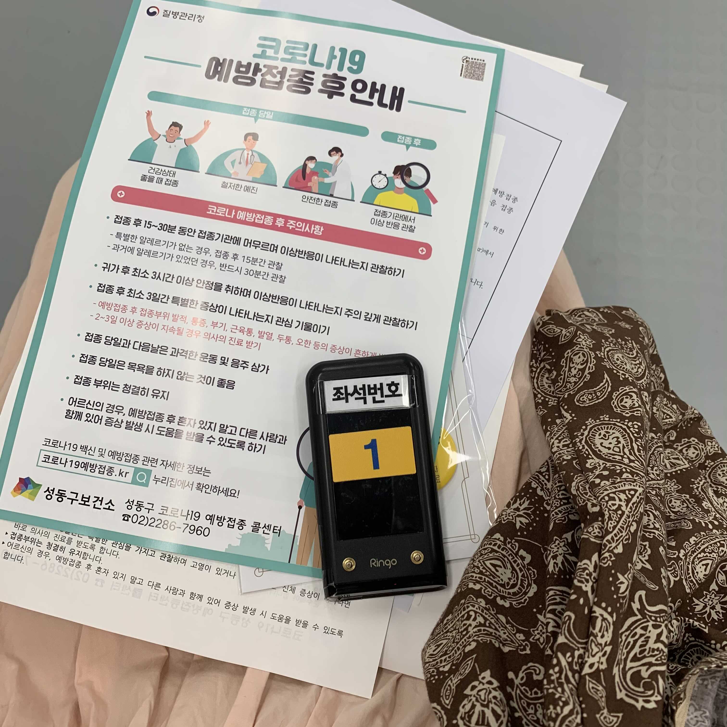 진동벨로 15분 지나면 알려주셔요! 당일날은 과격한 운동 및 음주 삼가, 그리고 접종 당일은 목욕을 하지 않는 것이 좋고 접종 부위는 청결하게 유지해야합니다!!! :)