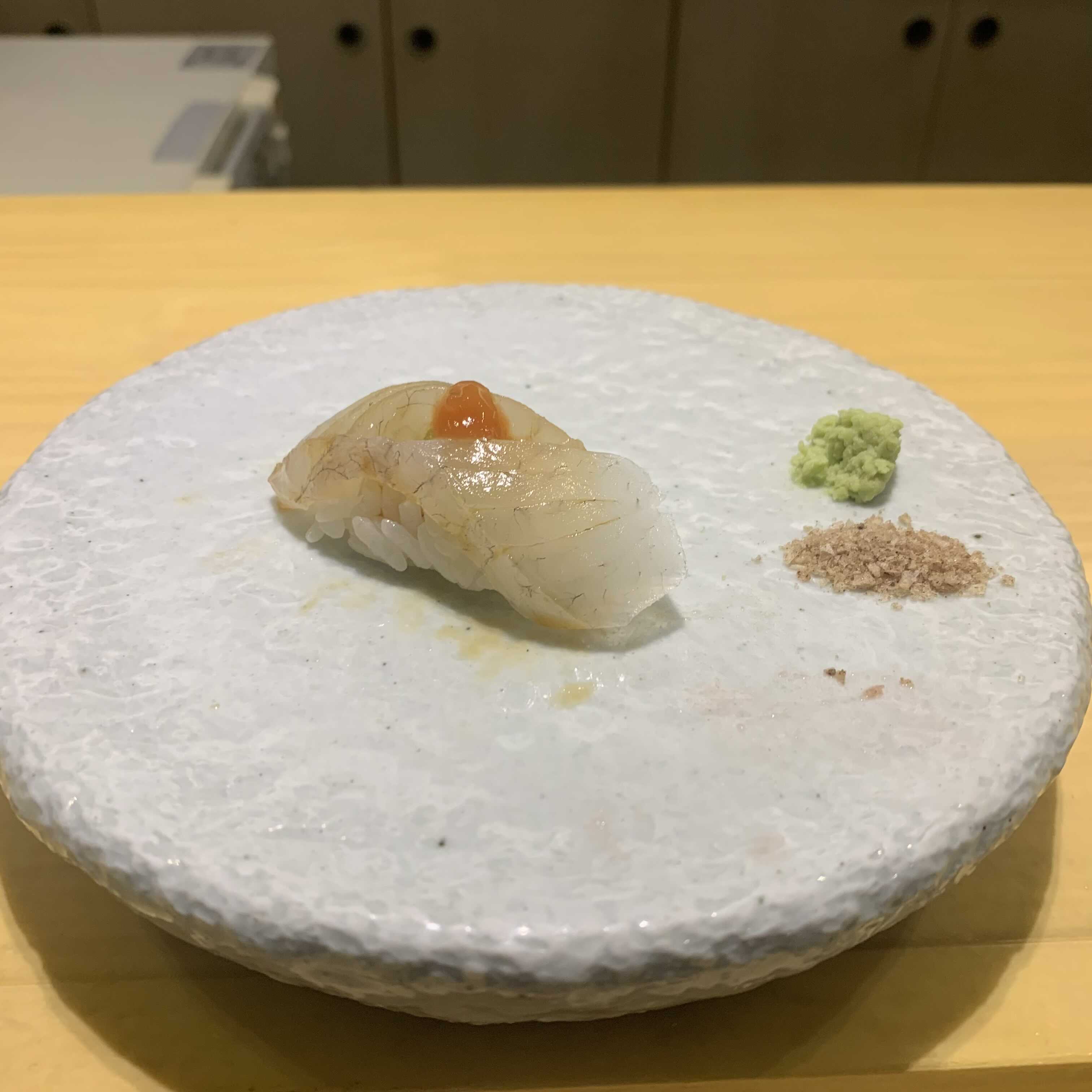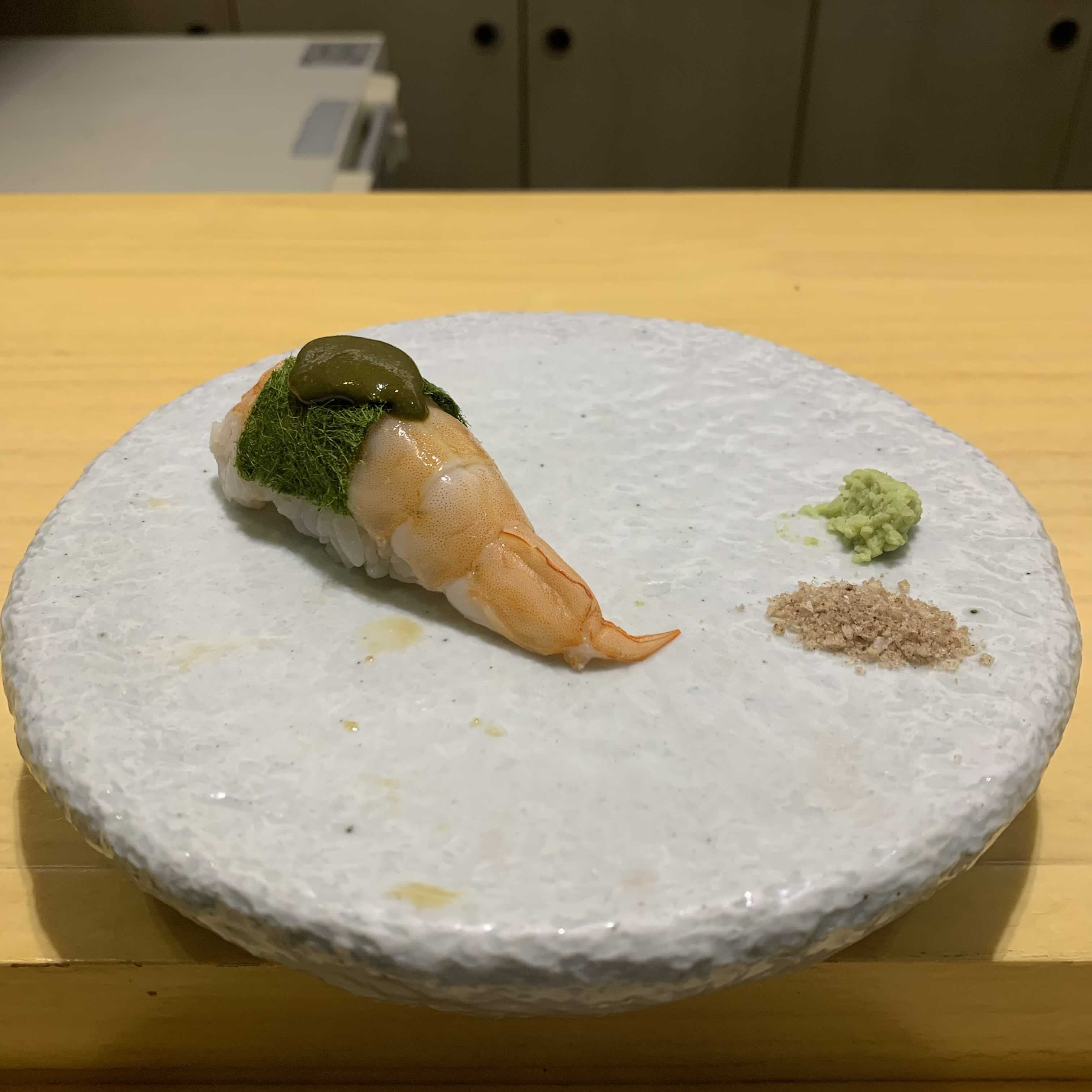 감태새우는 새우 위에 전복 내장과 감태가 올려져있어요. 처음 먹어보는데 찐 새우라 식감이 부드럽더라구요.
