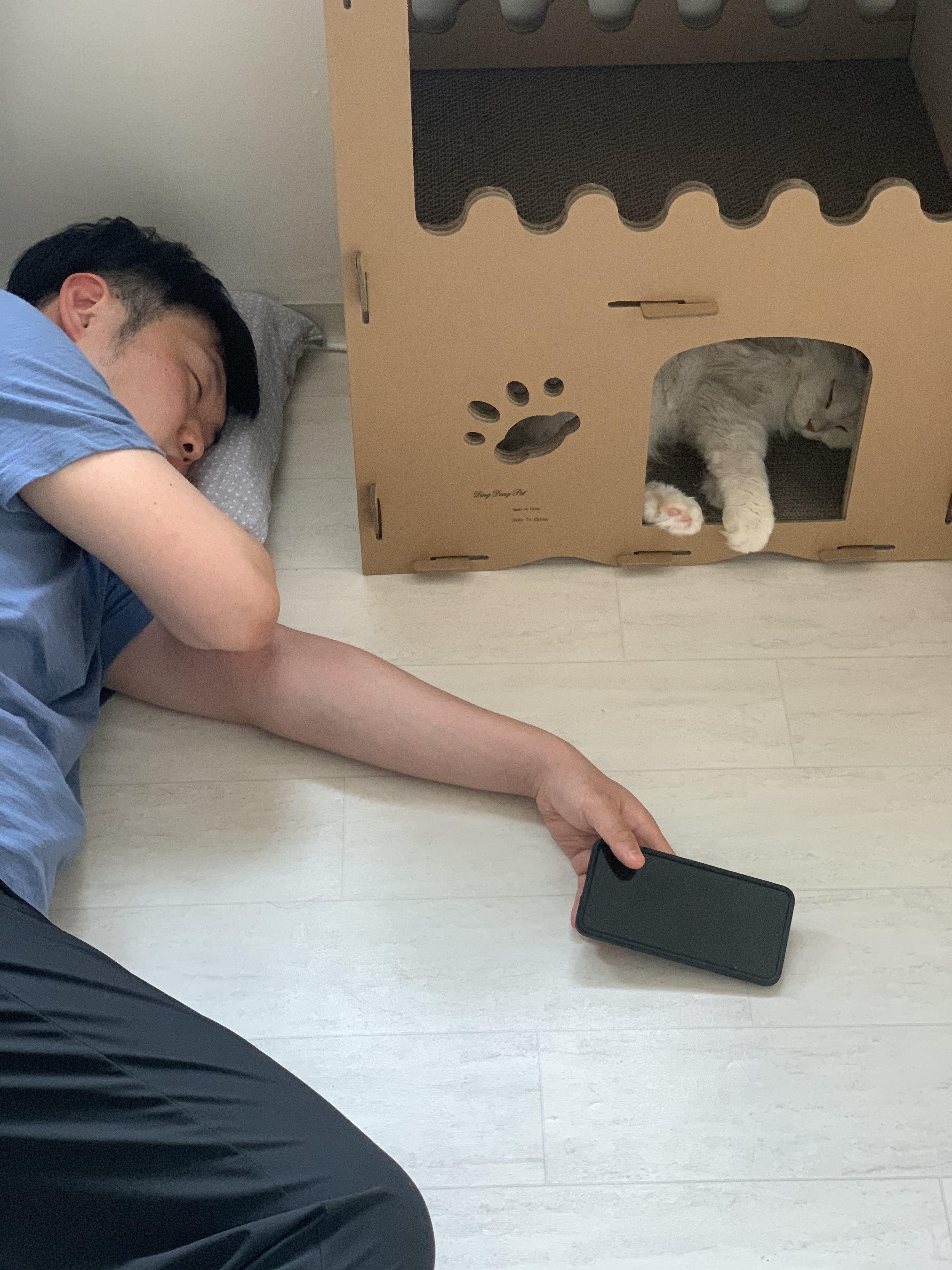 남집사가 바닥에 누워 잠들면 자기집 들어가서 같이 자고 (너무 예쁜 투샷 🤍)
