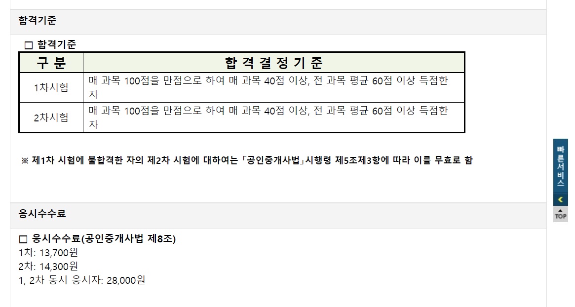 합격결정은 1차시험은 매 과목 40점 이상, 전 과목 평균 60점 이상 득점한 자.