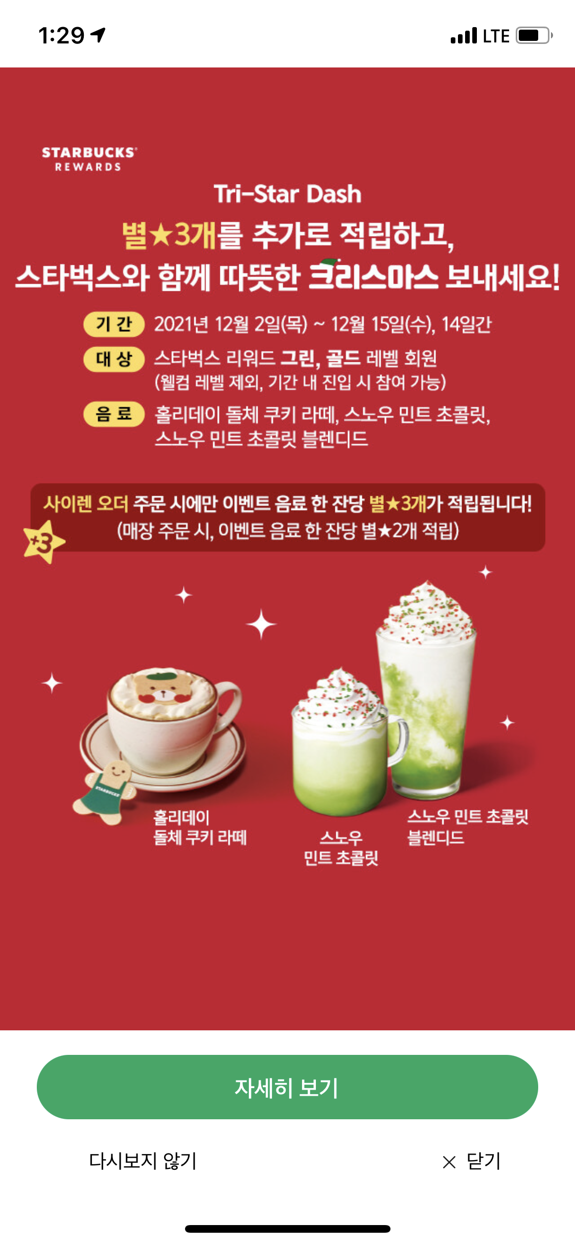 스벅 프리퀀시를 적립하는걸 보니 겨울이긴 겨울인가봅니다.