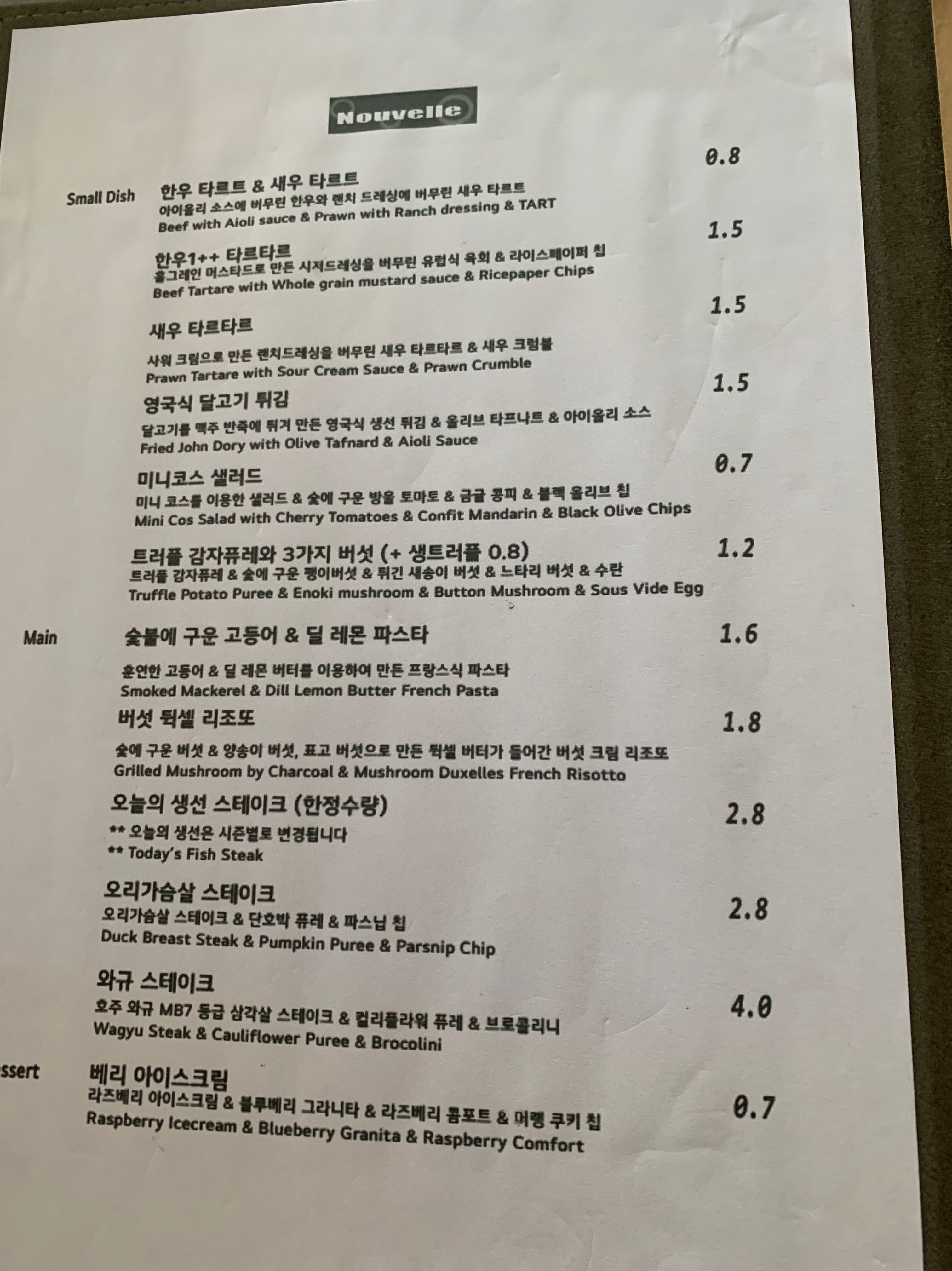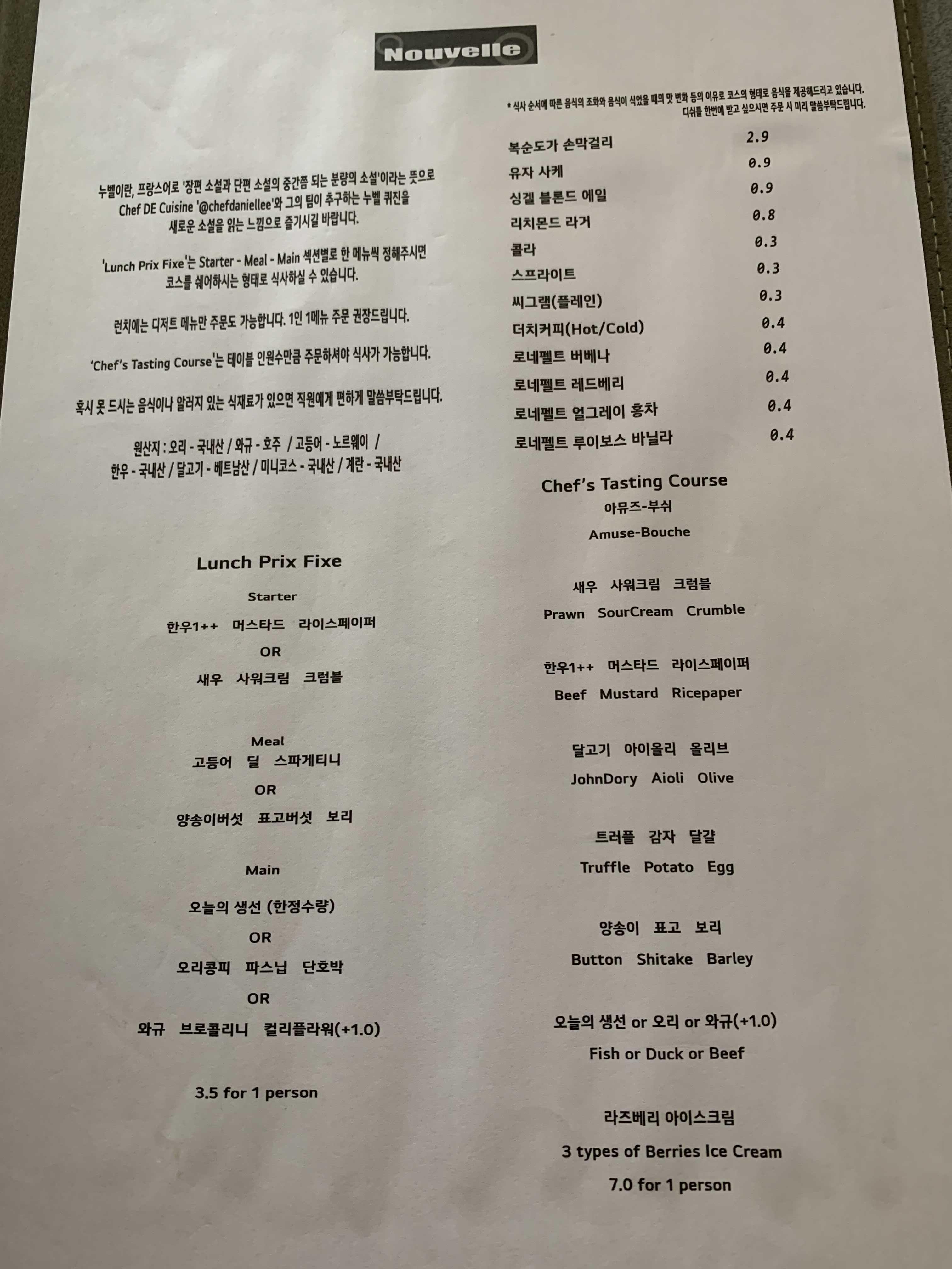가게 이름이 너무 예쁜 이름이라 눈이 갔는데, 누벨의 뜻은 프랑스어로 '장편' 소설과 '단편'소설의 중간쯤 되는 분량의 소설이라는 뜻이라고 합니다. 런치메뉴로는 코스로 1인 35000원에 맛 볼 수가 있고, 세프 코스로는 1인 7만원으로도