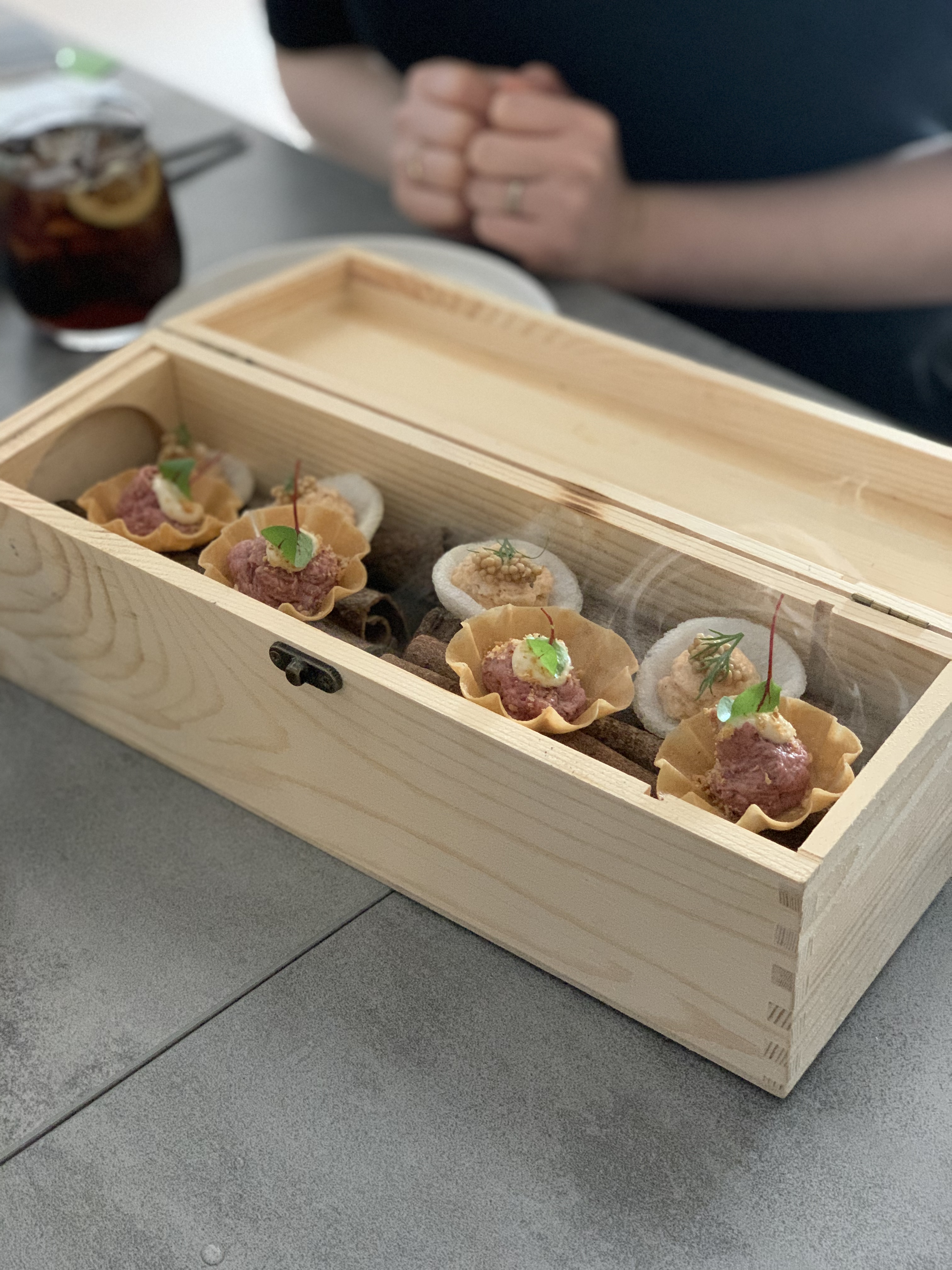 한우타르트 & 새우 타르트 2개, 한우 1++ 타르타르, 새우 타르타르, 영국식 달고기 튀김, 버섯 뒥셀 리조또,